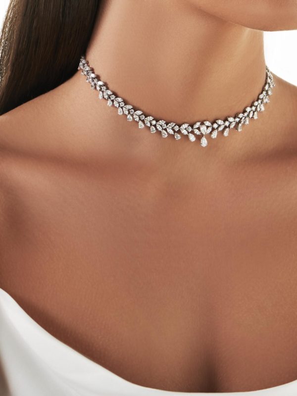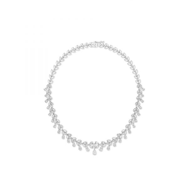 The Diamond Drops Necklace custom made in 18K White Gold featuring Round, Marquise and Pear Diamond weighing 11.50 carats combined total weight with F Color and VS1 Clarity.