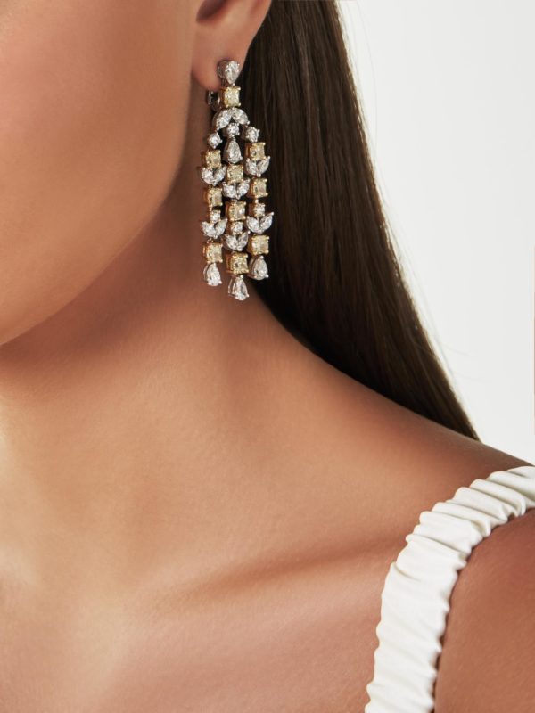 The Flying Harmonia Earrings custom made in 18K White Gold featuring Round diamond, Marquise and Fancy Yellow Diamond weighing 24.60 carats combined total weight with F Color and VS1 Clarity.