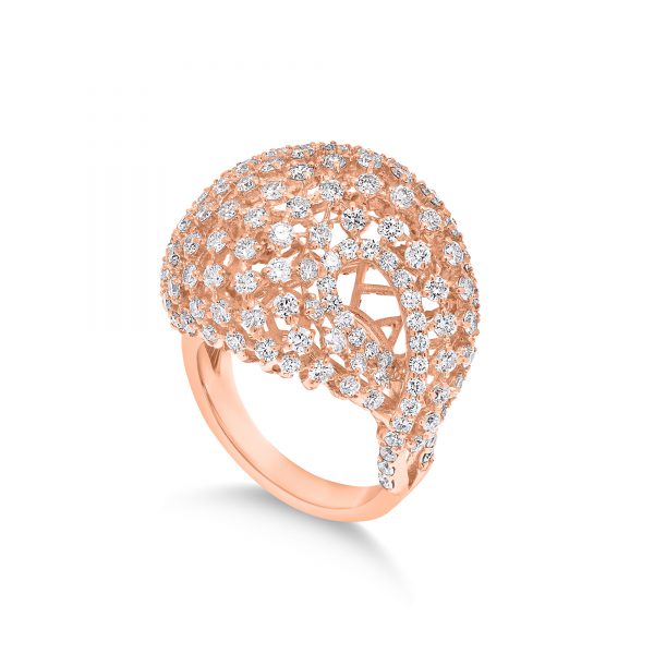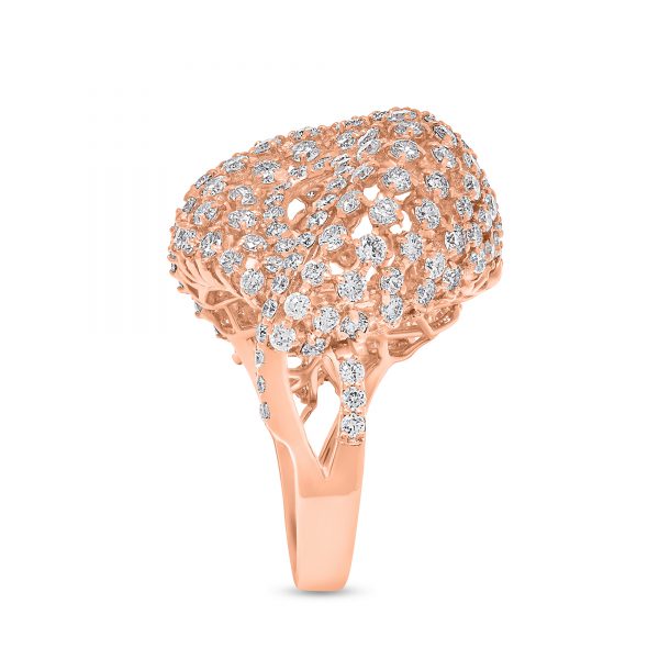 The Malika Ring custom made in 18K Rose Gold featuring Round Diamond weighing 3.56 carats combined total weight with F Color and VS1 Clarity.