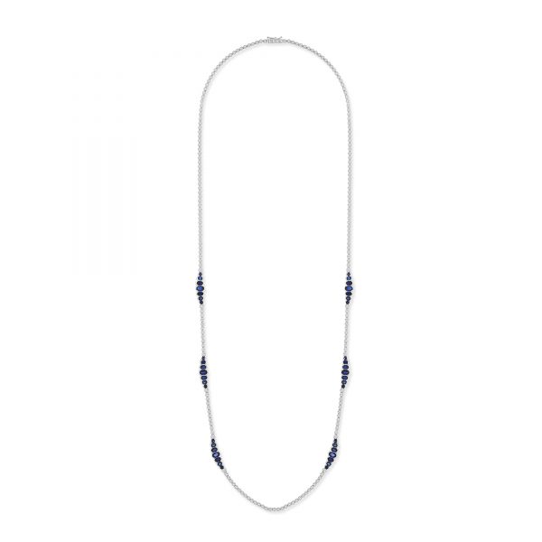The Sparkle Sister Amphitrite Necklace custom made in 18K White Gold featuring Round Diamond and Sapphire weighing 4.49 carats combined total weight with F Color and VS1 Clarity.