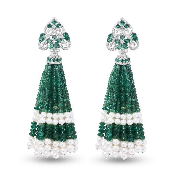The Lady of Nature Earrings custom made in 18K White Gold featuring Pearl, Emerald and Round Diamond weighing 1.66 carats combined total weight with F Color and VS1 Clarity.